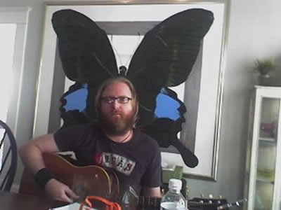 Prior to laying down tracks, Dan and Eric and I would meet up at my house for what we called “TeePee Time.” (We got this name from the kid’s teepee at our house.) When we would “teepee up” we would drink MUCH coffee, and discuss song choices and general ideas for how to handle each choice musically. Dan snapped this photo of Eric and guitar in front of our butterfly painting, painted by my friend John Richardson(see “shouts outs” above). It is still undecided as to whether Eric was becoming Butterfly, or Butterfly was becoming Eric. Either way, there was real transformation a foot.